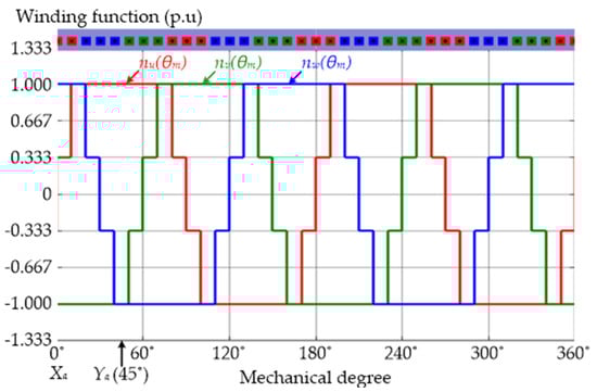 where N is the number of the winding turns. Moreover, nu(θm), nv(θm), and nw(θm) are the winding functions of the phases defined in Figure 7.