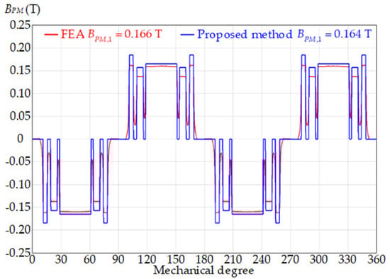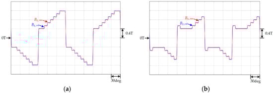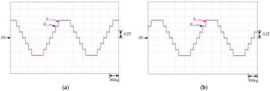 In the case of an ideal SPMSM, the minimal winding area and non-slot structure are built to minimize the saturation effect. Moreover, the PM will be removed when the flux density is generated in the air gap by the three-phase current. The equivalent air gap could be regarded as a summation of the length of the air gap and the PM’s thickness. It ensures the linear permeability of silicon steel for the ideal SPMSM; hence, the ks in Equation (9) is assumed to be a unity for the ideal SPMSM. The Bs waveforms of the proposed method and the FEA-simulated result are illustrated in Figure 8.