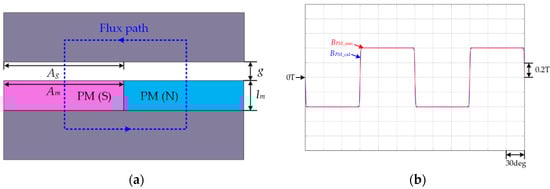For the definition of a flux path generated by PMs for an ideal SPMSM, the calculated and simulated results are shown in Figure 9; the absolute peak value of BPM is expressed as follows: