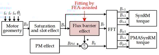 Because the complicated rotor structure and saturation problem occur in the IPMSMs with flux barriers in the rotor, some coefficients are calculated using FEA-assisted. Figure 11 displays the flowchart of the proposed method for estimating the average torque of a synchronous motor. First, the three-phase current (iu, iv, and iw) is used as the input source to analyze the stator winding distribution and calculate the linear flux density at the air gap (Bsl). Subsequently, the geometries of the stator and rotor, which are made of silicon steel, the effect of the stator slot, and the nonlinear behavior of silicon steel are used to determine Bs under different currents. Moreover, Br is generated when Bs flows through the rotor, and Br can be calculated using the proposed method from the rotor reluctance for a simple rotor structure (such as a SPMSM or an IPMSM with a single-layer rotor barrier). However, the motors designed in this study have a complex reluctance distribution because of their three-layer rotor barrier; thus, FEA is used to analyze the form factor of the rotor to obtain a more accurate Br value. Subsequently, BPM is derived, and Bg is calculated by summing Br and BPM. Finally, the flux density in the air gap is analyzed by determining the fundamental component to calculate the average output torque of the motor.