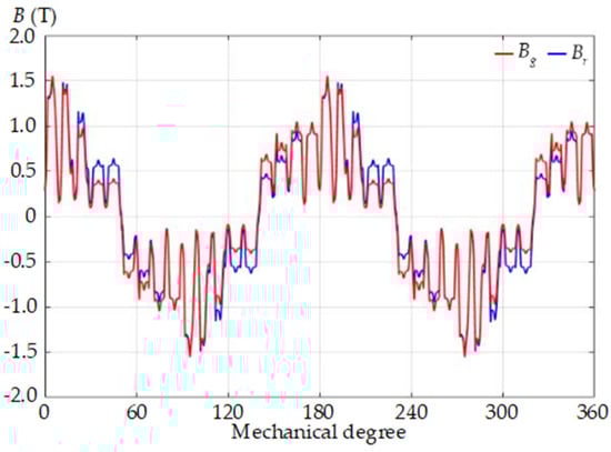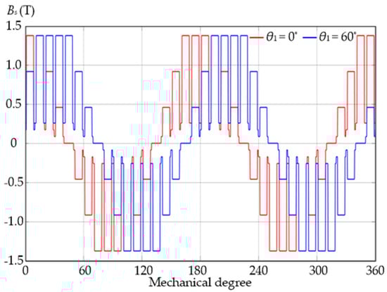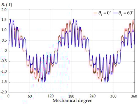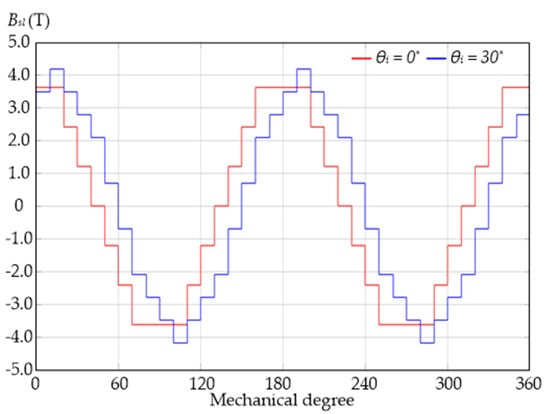 When the flux generated by the stator winding flows through the rotor, its magnitude is affected by the reluctance of the flux barriers. As displayed in Figure 28, the current angle varies with the position of the fixed rotor. The minimum rotor reluctance is achieved when θi is 0°; in this case, Br is similar to Bs. The reluctance increases with θi, which causes a decrease in the magnitude and phase of Br. The waveform of Br obtained through FEA under the rated current and different θi values is displayed in Figure 29. The magnitude and phase of the fundamental component Br,1 are presented in Table 6.