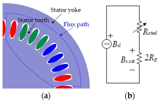 Because of the requirements of the winding space, the width of the flux path is reduced by the stator slot. A complete magnetic circuit in a 1/4 motor model is displayed in Figure 13a. In this circuit, the saturation phenomenon becomes more serious at a greater stator current. In order to consider the effect of magnetic flux saturation on the flux density in the air gap (Bs,sat), the magnetic circuit displayed in Figure 13b is constructed. When the saturation of the silicon steel increases, the reluctance of the silicon steel also increases, which results in a decrease in Bs,sat.