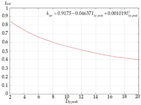 The saturation coefficient ksat is affected by the current magnitude indicated in Equations (15)–(18). This coefficient can be regarded as a magnitude scaling factor. The relationship between ksat and the three-phase current I3p is shown in Figure 14. The term ksat is equal to approximately 0.39 under a rated current of 20 Apeak (Ip = 9.4 Arms).