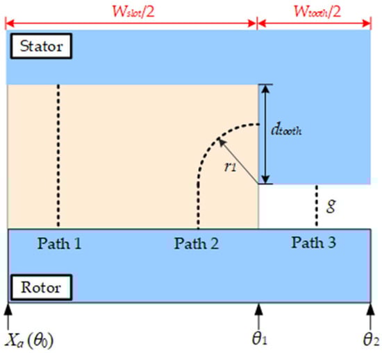 In addition, because the flux density in the air gap is affected by the slot structure, which results in variation in the equivalent length of the air gap, the authors of [,,] modified the air gap’s length using Carter’s coefficient. In the present study, the stator structure is modified using a simple model, which is displayed in Figure 15. The model displayed in this figure is a half-slot model with θ0 as the symmetrical axis. The flux paths in the air gap in this model are defined as follows: