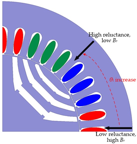 When the flux provided by the stator winding flows through the rotor, the rotor exhibits different flux densities Br in the air gap depending on the relative position of the flux path from the rotor barrier, as displayed in Figure 17. In this study, the relationship between Bs,1 and Br,1 is obtained by fixing the rotor position and adjusting the magnitude and phase of the three-phase current, which is the same as the operating condition at t = 0. The equivalent magnetic circuit can be directly calculated if the rotor structure is simple. However, the proposed motors have a complex three-layer rotor barrier; thus, the fitting relationships of θi with Br,1 and θr,1 are determined under the rated current through FEA. The relationship between Bs,1 and Br,1 can be expressed as follows: