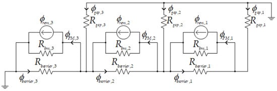 where BPMR is 1.16 T, which is defined as the flux density of a PM’s remanence from the datasheet. The cross-section of PMs (Am) and the related air gap (Ag) are the same. Moreover, the permeability of PMs is similar to air; hence, Equation (12) could be rearranged as below.