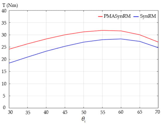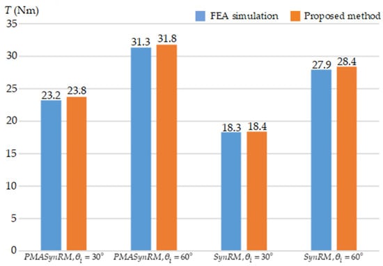 The output torque obtained through FEA under the rated current is displayed in Figure 32. The speed of the proposed PMASynRM is set as 1200 rpm, and its average torque (TAvg) is set as 23.2 and 31.3 Nm when θi = 30° and 60°, respectively. Figure 33 depicts the TAvg values obtained through FEA simulation and the proposed method for the proposed SynRM and PMASynRM under different operation conditions; the maximum error is less than 2.6%.