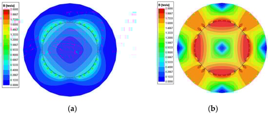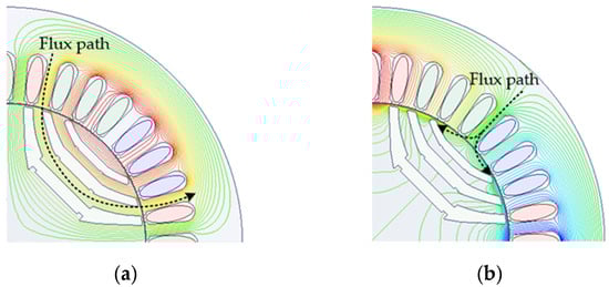 Flux density distribution under different phase currents when θi = 0° and different phase currents: (a) 1 Arms and (b) 9.4 Arms.
