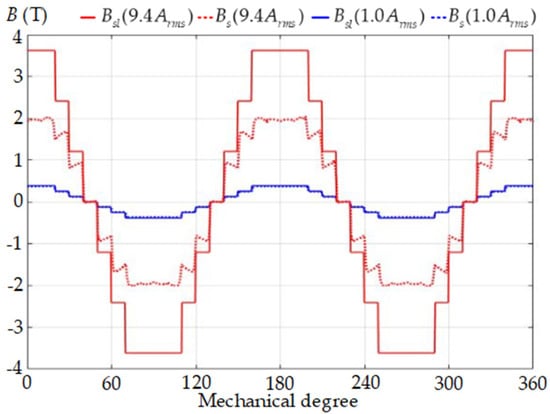 Using Equation (11), Bsl is calculated under a rated phase current of 9.4 Arms and θi values of 0° and 30° (Figure 12). Moreover, the magnitude of the fundamental component Bsl,1 is 3.9 T, and this magnitude is unaffected by the lead current angle. In addition, the maximum flux density of general silicon steel is less than 2 T. Therefore, the calculations in this section are performed by considering the influences of magnetic saturation and the stator slot.