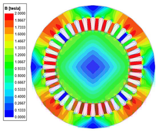 The flux density distribution obtained when considering the stator slot effect is displayed in Figure 26. The flux saturation at the yoke and tooth is higher when considering this effect than when not considering this effect (Figure 24b).
