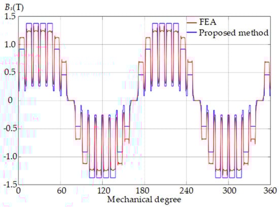 As the equivalent air gap length at the slot is increased, the flux density in the air gap decreases considerably. Figure 27 shows the waveform of Bs obtained through FEA simulation and the proposed method. The maximum error in the fundamental component magnitude is 0.9%.