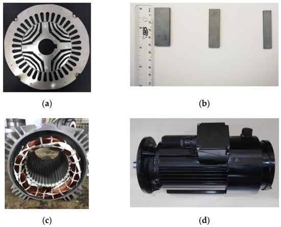 Parts of the PMASynRM and the complete assembled motor: (a) rotor and stator; (b) ferrite PM; (c) winding; and (d) complete assembled motor.