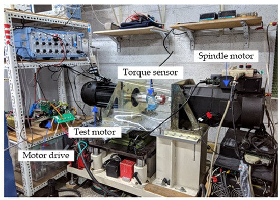 The parts and testing setup of the designed PMASynRM are depicted in Figure 34 and Figure 35, respectively. The torque sensor manufactured by Kistler was used to measure the average torque, and the incremental encoder in the PMASynRM had a pulses per revolution value of 2500; the adopted control methodology with a sinusoidal pulse width modulation (SPWM). A digital signal processor (DSP-TMS320F28075, Texas Instruments, Dallas, TX, USA)-based test platform was constructed to verify the effectiveness of the FEA simulation and proposed calculation method.
