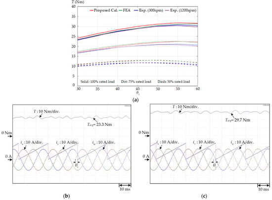 Figure 36 displays the output torques of the proposed PMASynRM under different loads and angles at rotation speeds of 300 and 1200 rpm. This figure depicts curves for the MTPA under various current magnitudes. The magnetic saturation of the motor increased as the current increased. Moreover, the θi value corresponding to the maximum torque increased from 45° to 55° when the phase current was increased from 50% of the rated load (4.7Arms) to the rated load (9.4 Arms). This phenomenon suggests that the effect of magnetic saturation must be considered when torque control is used. Similar MTPA results were obtained through FEA and the proposed method. In addition, the MTPA current must be the same within the voltage limitation of the inverter. The differences in the experimental results under different motor speeds might have been caused by material characteristics, core loss, and mechanical effects. Nevertheless, under the aforementioned conditions, the maximum error between the results obtained through FEA simulation, the proposed calculation method, and experimentation was less than 10% under a rated current, wherein the quantitative comparison of the torque results is shown in Table 7. Moreover, the motor efficiency of the FEA-simulated and experimental results under a rated current with 60° of θi is 91.1% and 90.7%, respectively. The core loss caused by the saturation phenomenon of the motor mentioned in Section 4 would decrease the motor efficiency.