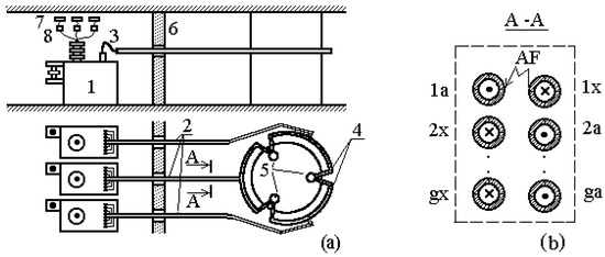 A staggering arrangement of the bus tubes in a busbar assembly is the most common in ore-thermal production [2]. An example of this arrangement is shown in Figure 1b. As is seen from this figure, the busbar assembly consists of two columns of bus tubes and G rows. The direction of current in the bus tubes is designated by (×) and (●). This arrangement of current conductors in a busbar assembly is bifilar, which makes it possible to decrease the strength of a magnetic field that is produced by the currents in the busbar assembly and, hence, to reduce its inductance and the loss of energy in it [3,4,5,6]. With such an arrangement of bus tubes in a busbar assembly, AFs can occur only between bus tubes of one split, i.e., between bus tubes in one row.