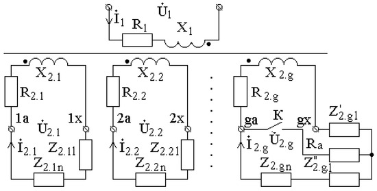 Hence, if the resistance of the compensator, flexible couplings, systems of shoes, and contact clamps is neglected, then currents in the bus tubes of a single-phase furnace transformer with G splits in the secondary winding in the operation mode and in the case of AF can be simulated according to the circuit in Figure 2 and the mathematical model suggested in [16]. In the circuit, an AF in the gth pair of bus tubes is implemented with the use of contact K. The designations in Figure 2 are as follows: