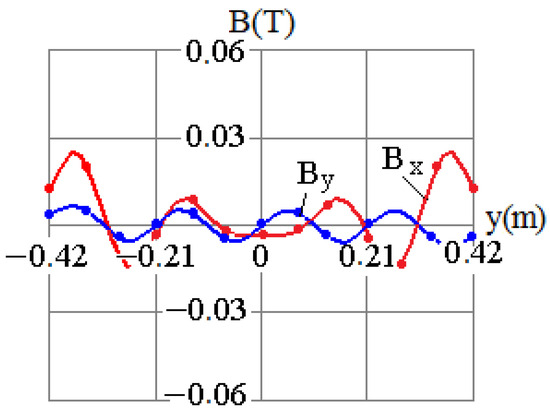 The experimental results are shown in Figure 4 with dots, and the calculation results are shown with curves Bx = f(y) and By = f(y). They are derived from the currents in the bus tubes of the busbar assembly at the coordinate xA = 0.21 m in the normal operation mode during the first stage of the transformer adjustment. The comparison between the calculation and experimental results in Figure 4 shows that the error in the magnetic field components that are calculated with the suggested mathematical model is no more than 10%. Hence, this mathematical model is applicable for determining the positions of MCTs with respect to a busbar assembly, the number of windings, and their sizes.