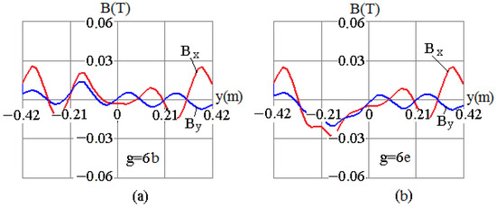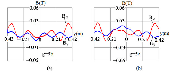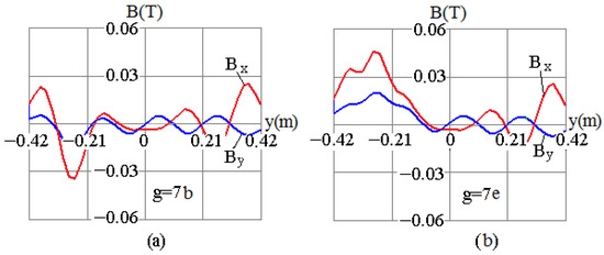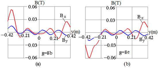 The positions of MCTs with respect to the busbar assembly are determined from the dependences Bx = f(y) and By = f(y), simulated for both the normal operation mode and the event of an AF in the 5th–8th splits of the secondary winding, which are shown in Figure 5, Figure 6, Figure 7 and Figure 8, respectively. The simulated dependences Bx = f(y) and By = f(y) in the region of a pair of bus tubes with the current are shown in Figure 5a, Figure 6a, Figure 7a and Figure 8a, and for the current , they are shown in Figure 5b, Figure 6b, Figure 7b and Figure 8b.