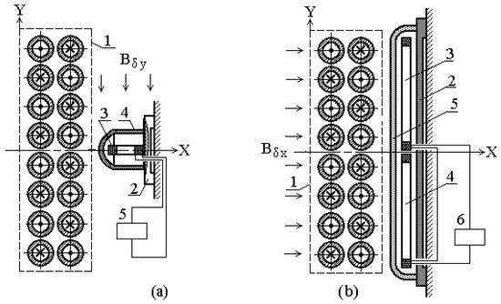 The analysis of the dependence Bx = f(y) in Figure 5, Figure 6, Figure 7 and Figure 8 shows it to be symmetrical about the X axis in the nondamaged busbar assembly, while the occurrence of an AF in any pair of bus tubes disturbs this symmetry. This property of the dependence Bx = f(y) can be used for designing an AF protection. In this design, an MCT with two windings should be used, and the windings should by symmetrized about the X axis of the busbar assembly like in Figure 9b, where 1 designates the busbar assembly, 2 shows the MCT, 3 and 4 mark windings, 5 marks the isolating casing, and 6 shows the discriminating element of the protection. In this case, the value of ∆Bx, which is the difference between the mean values of the horizontal magnetic field induction component Bx in the planes of the MCT windings, is used as information about an AF.