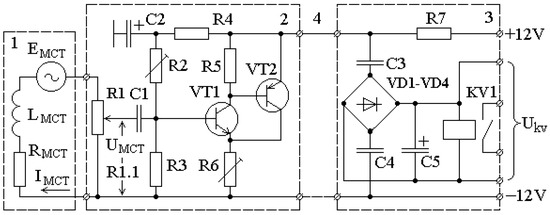 This can be avoided if a cable amplifier is used to transmit information from the MCT to the discriminating element. This enables one to not only take into account the low output power of the MCT and the interference from external magnetic fields, but also to use only a two-core cable for data transmission. The diagram of current protection with an MCT and a cable amplifier is shown in Figure 10, where an MCT is marked by 1, a cable amplifier is shown by 2; a discriminating element is signed by 3, and a connecting cable is indicated by 4.