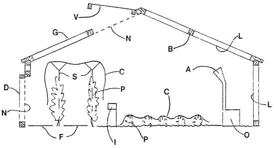 General system setup as proposed by Huber’s patent n° GB2120065A. Meaning of letters: “D” door, “O” magnetron oscillator, “A” horn antenna, “L” reflecting liner, “G” glazing, “B” glazing bars, “V” ventilators, “N” metal mesh, “F” metal foil, “P” plants to be heated, “C” film of thin, clear, polythene sheet, “S” plant supports, “I” infra-red detector.