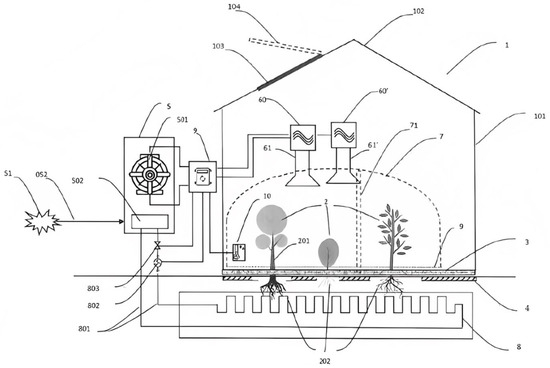 General system setup as proposed by Carusi et al. [8] patent n° WO2021079263A1. Meaning of symbols: “1” greenhouse, “3” soil, “4” subsoil, “101” protection structure, “102” roof, “103” opening, “104” open opening, “2” containment of plants, “201” aerial region, “202” root region, “S1” natural gas energy from anaerobic digesters, “0S2” conduits, “S” generator, “S01” electrical energy production device from natural gas, “S02” heat exchanger, “801” circulating fluid, “8” heat exchangers, “202” root regions, “2” plants. “802” hydraulic pump, “803” block valve, “60” microwave generators, “61” antenna, “10” climatic sensors, “7” membrane, “71” supports, “9” conductive sheet, “802” valve, “803” pump.