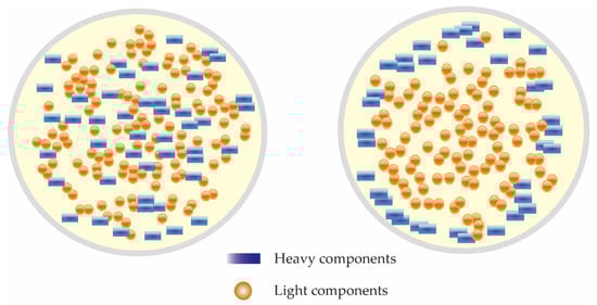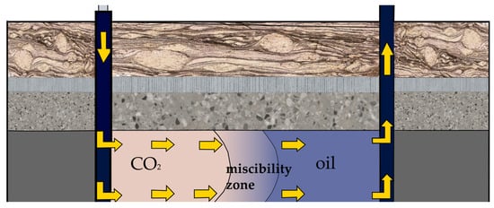 The minimum miscibility pressure (MMP) is a key parameter for evaluating and optimizing CO2 flooding in oil reservoirs, representing the lowest pressure at which gas and oil form a miscible phase. When the pressure (P) is lower than MMP, CO2 and oil do not mix, and the displacement process is dominated by mobility and capillary forces, leading to fingering and premature breakthrough. On the other hand, when P is higher than MMP, CO2 and oil reach a near-miscible or miscible state, the gas–oil interface disappears, the crude oil expands, and hydrocarbons evaporate. In the miscible flooding process, the capillary forces caused by pore size differences are significantly reduced, resulting in a significant increase in oil recovery efficiency [] (as shown in Figure 6). Conventional reservoirs are associated with convection-dominated transport, while unconventional reservoirs are associated with diffusion-dominated transport [], indicating that pore size to some extent affects MMP. The determination of MMP is generally based on the solubility theory, which can be expressed as: