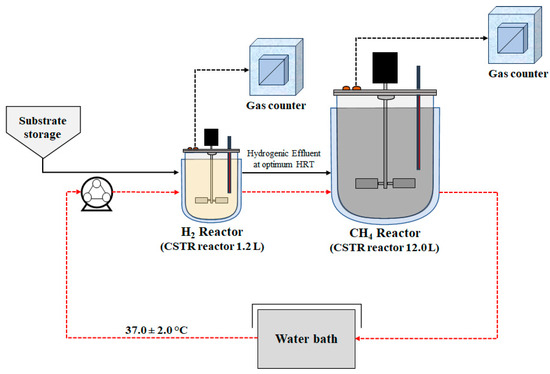 The TSAD process consists of two CSTRs, as depicted in Figure 1. A 1.2 L CSTR with a working volume of 1 L and a 13 L CSTR with a working volume of 10 L were used for the hydrogen and methane production reactor, respectively. The headspaces of reactors were directly connected to the gas counter. The reactor was continuously stirred at 150 rpm using a magnetic stirrer with a temperature of 37 ± 2 °C controlled by recirculating heated water through a jacket throughout the experiment. The experimental procedure commenced with the hydrogen production process in the initial-stage hydrogen production reactor (CSTR-H2). SCL was introduced into the reactor at an optimal concentration determined from batch experiments (Section 2.3). Subsequently, a 10% (v/v) inoculum was added to the reactor after adjusting its initial turbidity to 0.1 at a wavelength of 600 nm. The working volume was set to 1.0 L using the BA medium, and the pH was regulated to 7.2 by adding either 5 M HCl or 5 M NaOH. The reactor was tightly sealed, and nitrogen gas was purged into the reactor for 20 min to establish anaerobic conditions before initiating the hydrogen production process. The start-up phase of hydrogen production was conducted in batch mode for 7 days. Subsequently, when the system reached a steady state, hydrogen production rate (HPR) fluctuations not exceeding 10% of their average value, the process was shifted to a semi-continuous mode with HRTs of 5, 4, 3, and 2 days. The HRT yielding the highest HPR was the optimum HRT. The effluent was replaced with fresh media on a daily basis, in accordance with the HRT shown in Table 1. The hydrogenic effluent obtained at the optimum HRT was used as the substrate to produce methane in the second stage.