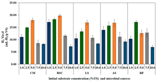 The trend of hydrogen yield (HY) of treatments that employed CM, RSC, LS, and AS as an inoculum increased with an increase in SCL concentrations ranging from 1% to 5% TS (w/v). A further rise in SCL concentrations to 7.5% and 10% TS (w/v) resulted in a drastic drop in HY for all treatments (Figure 2). The treatment that employed RSC as an inoculum showed the highest HY in the run with an SCL concentration of 5% TS (w/v), and a similar trend of decreased HY was observed when the concentration of SCL was increased (Figure 2). A maximum hydrogen yield of 19.7 mL-H2/g-VS was attained from the treatment of RSC with an SCL concentration of 5% TS (w/v). The low HYs obtained might be due to elevated concentrations of SCL, which limited microbial access to substrates and resulted in low microbial activities. These results are consistent with those of Margareta et al. (2020), who revealed that the bacterial growth rate was inhibited at high concentrations of substrates and metabolite products [18]. Considering the results on HY from using different sources of inoculum, it was observed that the highest HY was obtained from the treatment of RSC followed by CM, LS, AS, and RF, respectively. These results indicate that RSC was rich in cellulolytic microorganisms, which have the potential to decompose lignocellulosic materials. This finding is consistent with the research by Wongfaed et al. (2023), who observed that the enriched RSC consortium exhibited the highest filter paper degradation efficiency of 51.95% (VS basis) (w/v) with a xylanase activity of 0.66 international units/mL [19]. In contrast, the degradation efficiencies of CM, soil around goat and sheep stalls (SGS), and termite intestines (TI) were lower, with values of 44.25%, 50.81%, and 43.24% (VS basis) (w/v), respectively. The maximum HY of 19.7 mL-H2/g-VS obtained under the optimal condition of this study was slightly lower than the findings of Miftah et al. (2022), who reported that separate hydrolysis and fermentation of two-stage anaerobic digestion for hydrogen and methane production from deep eutectic pretreated SCL (4 g-VSadded/L) resulted in an increase in HY from 1.2 mL-H2/g-VS to 26.7 mL-H2/g-VS when compared to untreated SCL [20]. This result suggests that selecting a consortium with the ability to degrade lignocellulosic biomass as the inoculum source is an attractive approach to improving degradation efficiency and enhancing HY compared to chemical pretreatment.