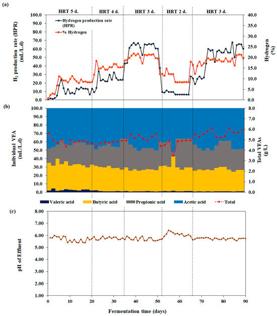 The profile of (a) HPR and hydrogen content, (b) concentrations of individual and total VFAs, and (c) pH level of hydrogenic effluent at different HRTs.