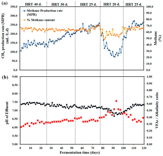 The profile of (a) MPR and methane content, and (b) pH level of methanogenic effluent and VFA/alkalinity ratio at different HRTs.