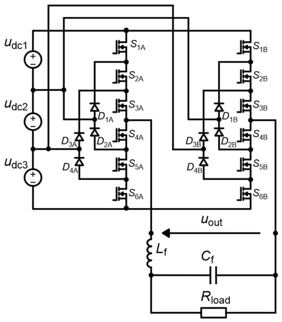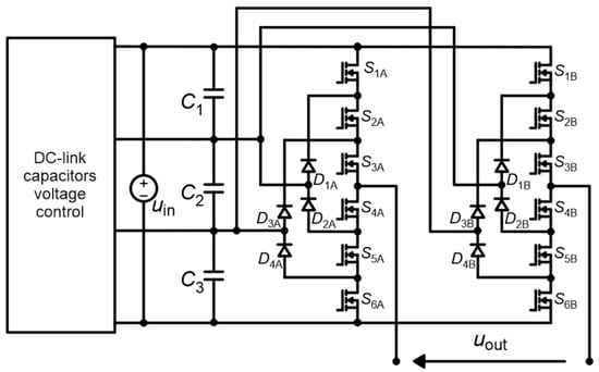 During experimental and simulation tests of the inverter, DC-link voltages are supported by independent sources, as displayed in Figure 8, which allows for precise inverter efficiency results.