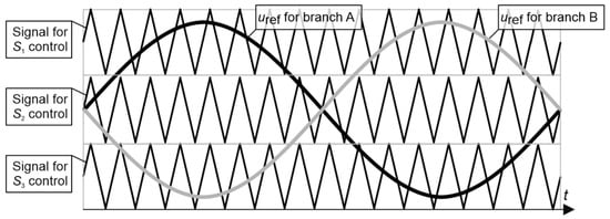 In order to ensure uniform discharge of DC-link capacitors, it is advantageous to implement modulation based on the selective selection of DC-link capacitors used. The method proposed in the literature [] evenly uses capacitors C1, C2, and C3 at each modulation level. The pulse width can be realized using the classic carrier-based method. Next, the state machine-based (SM-based) algorithm selects the implementation of the appropriate order of states of modulation and DC-link capacitors (Table 1) according to the algorithm presented in Table 3.