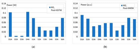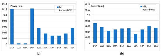 Simulation results of the loss distribution in the A-phase elements of an inverter using carrier-based M1 modulation (a) and SM-based M2 modulation (b). P. u. results are related to total losses in semiconductor devices. Rds(on) = 30 mΩ, Coss = 395 pF.