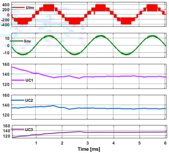 The SM-based M2 modulation is based on the selective selection of the loaded DC-link capacitor. Thus, it enables the implementation of the algorithm of DC-link voltage balancing. In the exemplary algorithm, the result of which is presented in Figure 5, a change in the index of the loaded capacitor was used when the inverter performed modulation. In the basic SM-based M2 algorithm, the voltages from capacitors C1, C2, and C3 are used alternately (Table 3). In the unbalanced state, this algorithm has been replaced by switching using the highest voltage capacitor in the unbalanced state.