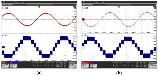 Steady state of operation with the output power at levels of 100 W (a) and 1000 W (b) and modulation type carrier-based M1. Load current (CH1) and unfiltered output voltage of the proposed inverter (CH2).