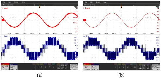 Steady state of operation with the output power on the level of 100 W (a) and 1000 W (b) and modulation type SM-based M2. Load current (CH1) and unfiltered output voltage of the proposed inverter (CH2).