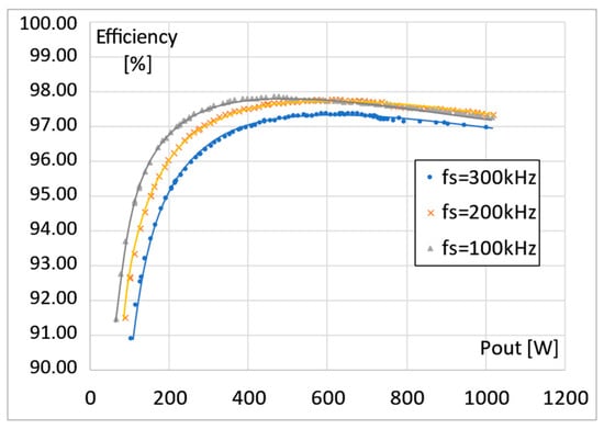 High-frequency operation can be beneficial due to the reduction in the volume of passive components. However, this can lead to large connection losses, which is why in the next stage of the experimental research on the proposed inverter, a study of the device’s efficiency was performed. During experiments, three efficiency curves were collected for different switching frequencies. They are shown in Figure 12. The best results were obtained for the switching frequency of 100 kHz. Two remaining curves, visible in Figure 12, were captured at 200 and 300 kHz of the switching frequency. From this graph, it is seen that switching frequency increases cause a decrease in the device’s efficiency, especially within the range of output powers lower than 400 W. Nevertheless, the device’s peak efficiency is surprisingly good and reaches a value of nearly 98%. Furthermore, the difference in peak efficiency between the 100 and 200 kHz switching frequency operations is very small.