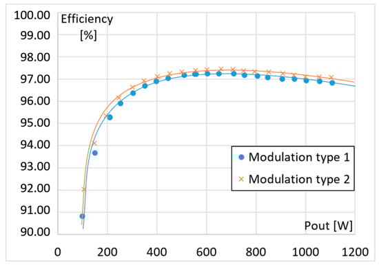 Efficiency curves of the 7LDCB inverter performed with two different modulation types (type 1: carrier-based M1, type 2: SM-based M2) at a switching frequency of 200 kHz. Efficiency is calculated as the ratio of the output to the input power of the inverter from all three power supply units.