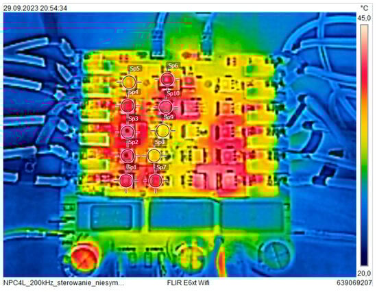 Figure 14, Figure 15 and Figure 16 show the results of thermal imaging measurements of temperature on the housings of transistor element diodes of A-phase at the switching frequency fs = 200 kHz and the output power Pout = 550 W. The results presented in Figure 14 and Figure 15 characterize the operation of the system with M1 modulation, while the results presented in Figure 16 are a comparison of the temperature of the system when controlled with M1 and M2 modulation. The temperature measurement points are shown in Figure 14 (Sp1–Sp10). All results shown in Figure 14, Figure 15 and Figure 16 are on the same color-related temperature scale that is located to the right of each thermal image.