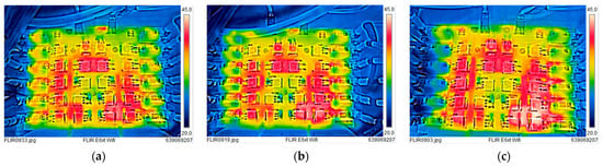 Figure 17 shows a comparison of the temperature of the Phase A elements of the system obtained on the basis of thermal imaging registration 10 min after switching on the system with an active power of 550 W. This is a very significant result that shows that the heating rate of the components with the SM-based M2 symmetrical control is lower, and most of the elements have a similar temperature. The distribution of losses is more even. The exact efficiency measurement results shown in Figure 16 also showed a higher efficiency of the inverter when using the SM-based M2 control method.
