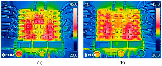 Figure 16 shows a comparison of the thermal imaging results of the inverter components using carrier-based M1 and SM-based M2 modulation one minute after switching on the inverter with a power of Pout = 550 W. From these results, it is clear that the M2 modulation results in a more even distribution of energy losses in the elements. This is in line with the assumptions of this modulation method, according to which DC-link capacitors and active components are used symmetrically at each level.