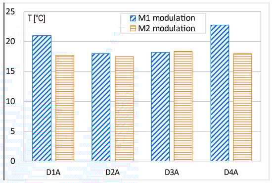 Results based on thermal imaging registration for carrier-based M1 and selective SM-based M2. Temperature measurement on the housings of the transistor and A-phase diode components for switching frequency 200 kHz, Pout = 550 W, Q = 0 Var, after 10 min from the start of the converter.