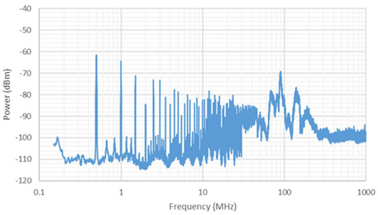 Then, for each position of the antenna along the path, the LABVIEW software acquires a full spectrum of the signal (Figure 5) in the chosen frequency band by means of an EMI test receiver or a spectrum analyzer.