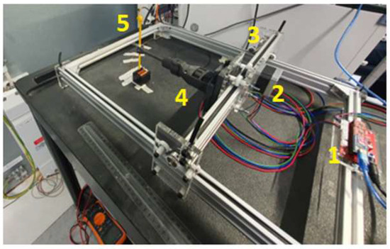 Equipment overview: 1—microcontroller Arduino Nano board and A4988 stepper motor drivers; 2—stepper motor for Y direction; 3—stepper motor for X direction; 4—nylon 3D printed head; 5—magnetic field antenna.