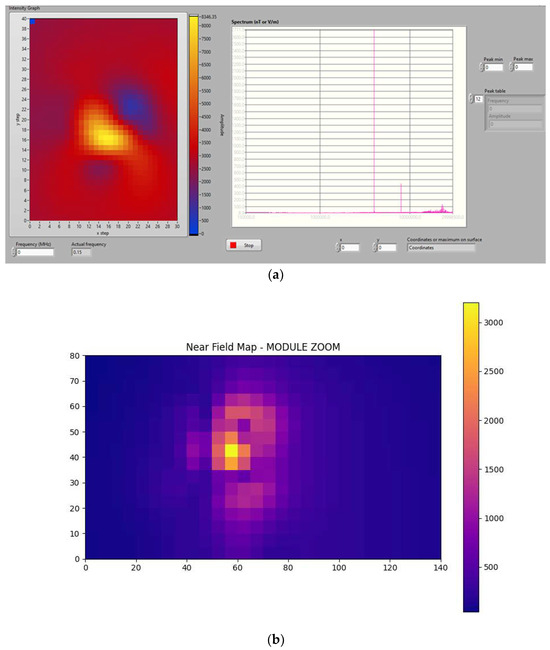 The spectrum and coordinates are saved for post-processing purposes for each point of the scanned surface. For example, using a color map to show the field intensity or one of their components, it is possible to also show the map of a single component of B or E magnitude on an XY plane. In the same post-processing window, it is possible to see the spectrum of the fields or that of its components. In this regard, portable Python 3 software has also been developed; this can be distributed together with the data files generated by the EMI receiver and allows the easy exploration of the fields’ maps for each orientation and each frequency (Figure 7).