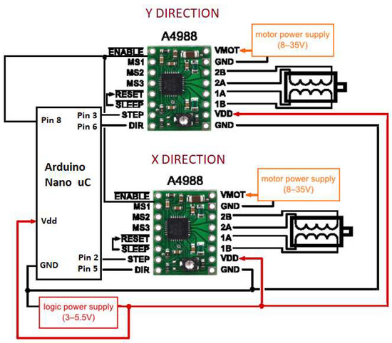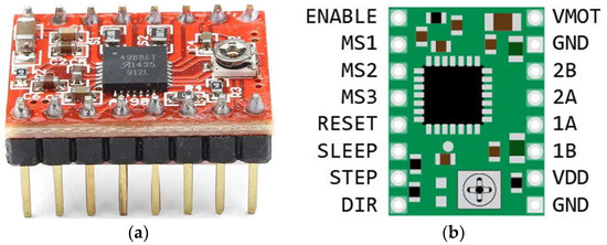 The controller board is made with an Arduino Nano microcontroller. The Arduino drives the two A4988 cheap stepper motor controllers through two pins. One sets the direction by pulling the DIR inputs of the A4988 boards up to 3.3 V or pulling them down to 0, and the other sends a square wave to the STEP pins (one period for one step). The microcontroller board also pulls down the ENABLE input in order to switch ON or OFF the modules. In Figure 8a, a simplified schematic of the controller is shown, while in Figure 9, the A4988 driver photo and pinout are shown.