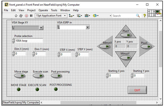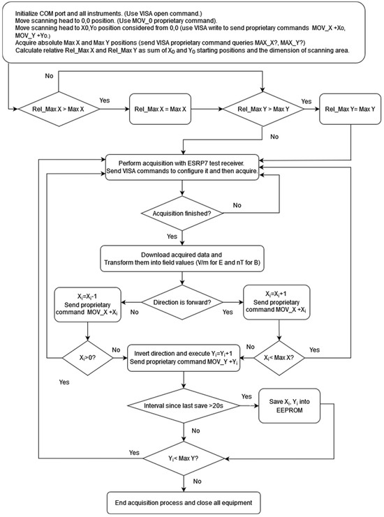 Figure 12 shows a flowchart with more information about the data acquisition algorithm. Concerning the data processing, a conversion routine has been embedded in the post-processing software used to relate the field magnitude with colors. A post-processing LABVIEW routine containing some automatic analysis capabilities has also been developed. In particular, it shows the maximum magnitude of the fields for each frequency of the analyzed spectrum. Moreover, the map for the frequency where higher fields (B or E) have been found can be requested. The developed Python post-processing software automatically provides the field intensity by positioning the pointer at the desired X–Y map pixel. The possibility to separately show the three components of the B or E fields and the map magnification are additional features.