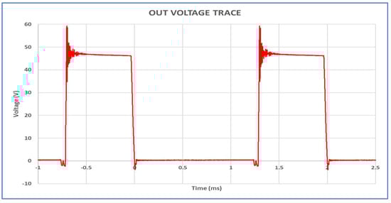 For this device, when working in the synchronous buck mode, oscillations (Figure 15) of the switch node caused by parasitic inductances and fast commutations were observed. The ringing generates an electromagnetic field and, therefore, problems of electromagnetic noise. However, to test the scanning equipment, only magnetic induction B above the big filtering output circuit inductor has been mapped.