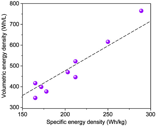 In order to obtain the comprehensive results, a total of 9 types of sample batteries were employed, including lithium iron phosphate (LFP) batteries with different capacities and ternary Li(NixCoyMnz)O2 (NCMxyz) batteries with ratios x:y:z of 5:2:3, 6:2:2, and 8:1:1. By weighing and measuring the physical outline of all tested batteries prior to each test, the specific energy density as well as volumetric energy density was compared in Figure 2. The specific energy density of the sample batteries ranged from 165 Wh/kg to 289 Wh/kg, showing a linear correlation with volumetric energy density because of the similar battery density as the dashed line in Figure 2. The slope of the fitted line is 2.39, close to 2.38 of Koch’s result [18], and ranging between 2 [28] and 2.7 [29].